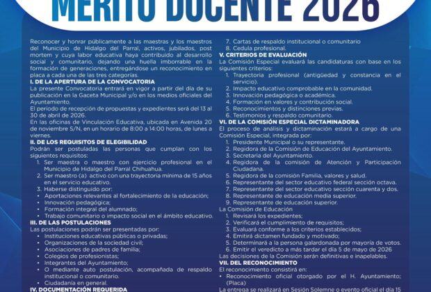 Emite Gobierno de Parral convocatoria al Reconocimiento al Mérito Docente 2026 -Se busca reconocer la trayectoria y aportaciones de maestras ... -