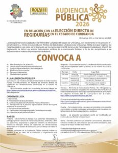 El H. Congreso del Estado de Chihuahua, a través de su LXVIII Legislatura, convoca a organizaciones civiles, instituciones académicas, medios de comunicación y a la ciudadanía en general a participar en las Audiencias Públicas 2026, enfocadas en el análisis de la iniciativa de ley para la elección directa de regidurías por demarcaciones territoriales.