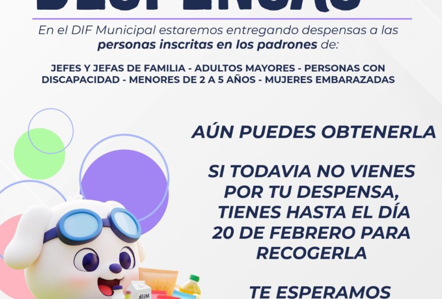 El DIF Municipal informó que, en caso de no recoger la despensa dentro del plazo señalado, el apoyo se perderá, por lo que es indispensable que el beneficiario acuda personalmente a realizar el trámite, con excepción de los menores, para quienes puede presentarse su tutor o responsable.