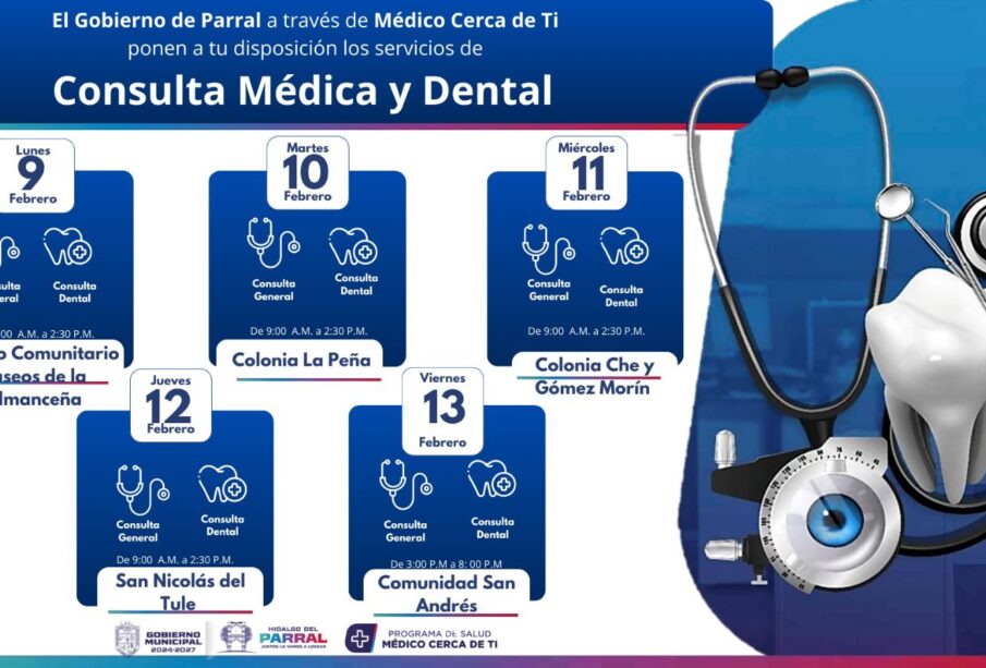 El Gobierno de Parral, a través del programa Médico Cerca de Ti, dio a conocer la programación de consultas médicas generales y dentales gratuitas que se llevará a cabo del 09 al 13 de febrero, con el objetivo de acercar los servicios de salud a las familias del municipio.