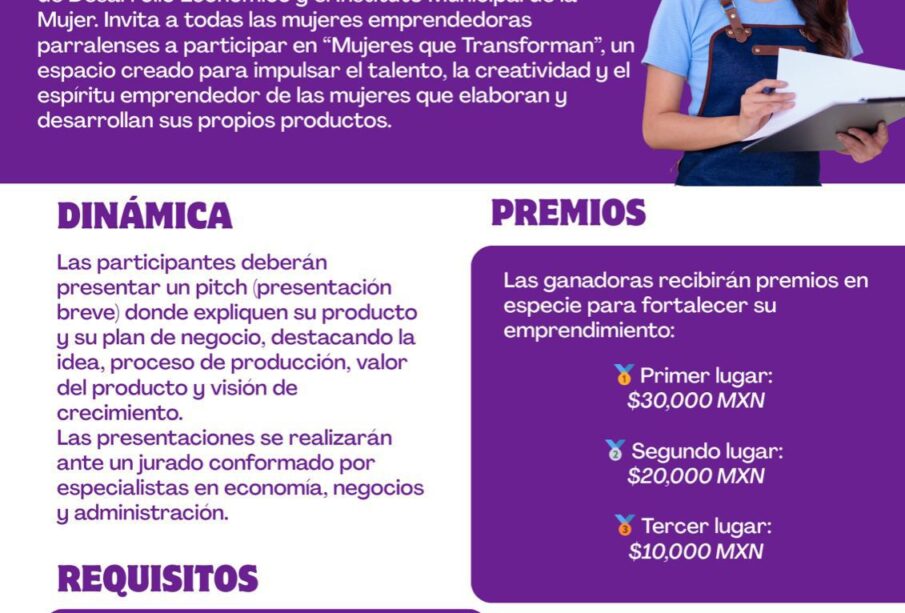 El Gobierno de Parral, encabezado por el alcalde Salvador Calderón, a través de la Dirección de Desarrollo Económico y el Instituto de la Mujer, convoca a mujeres emprendedoras del municipio a participar en el programa “Mujeres que Transforman”, iniciativa orientada a impulsar el talento, la creatividad y el desarrollo empresarial femenino.