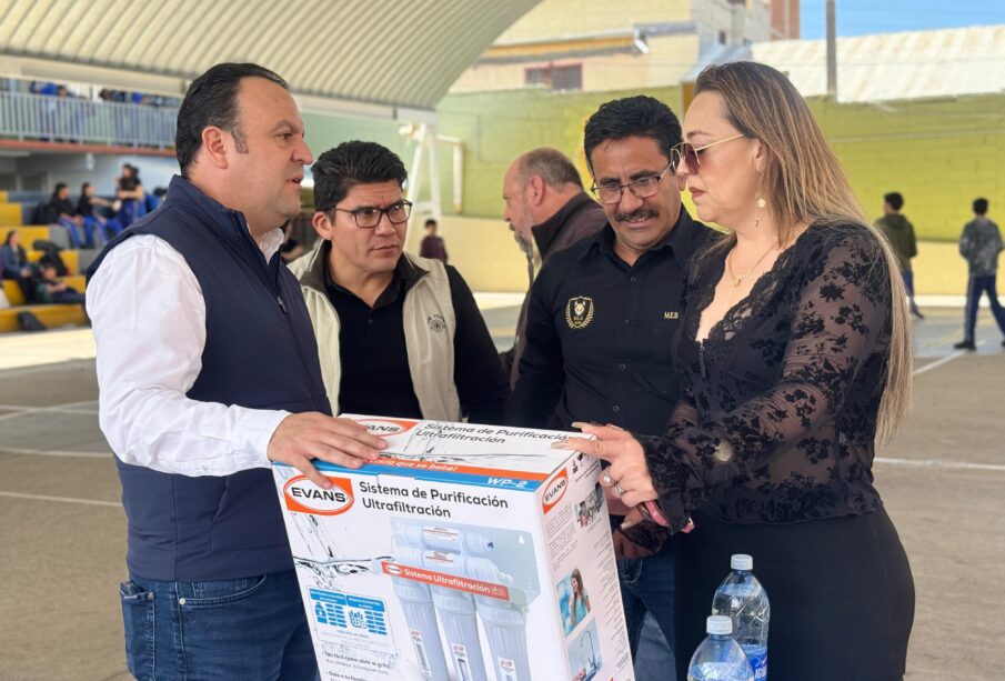 Memo Ramírez y JMAS entregan sistema de filtros para purificar agua en secundaria Francisca Lozano Olivas