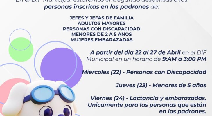 El DIF Municipal realizará la distribución de apoyos alimentarios para personas inscritas en los padrones oficiales El Gobierno de Parral, a través del Desarrollo ...Localizan restos óseos durante rastreo en la Presa Torreoncillos, en Matamoros