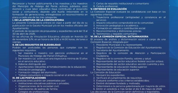 Emite Gobierno de Parral convocatoria al Reconocimiento al Mérito Docente 2026